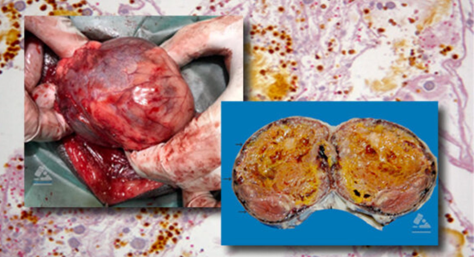 Fig.1. Aspecto de la masa durante la laparotomía. Observa que es muy irrigada. Foto cortesía de la Dra. Jessica Mora.Hallazgos Macroscópicos: se recibe una masa semi-redonda de 9.0×7.0x5.50 cms, de diámetro; cubierta por una cápsula de tejido conectivo y adiposo. Al corte la pared de la cápsula está engrosada y un poco aumentada de consistencia. El contenido de la masa es suave, de aspecto esponjoso y de un color rojo con anaranjado. Ver fig. 2-A y B.