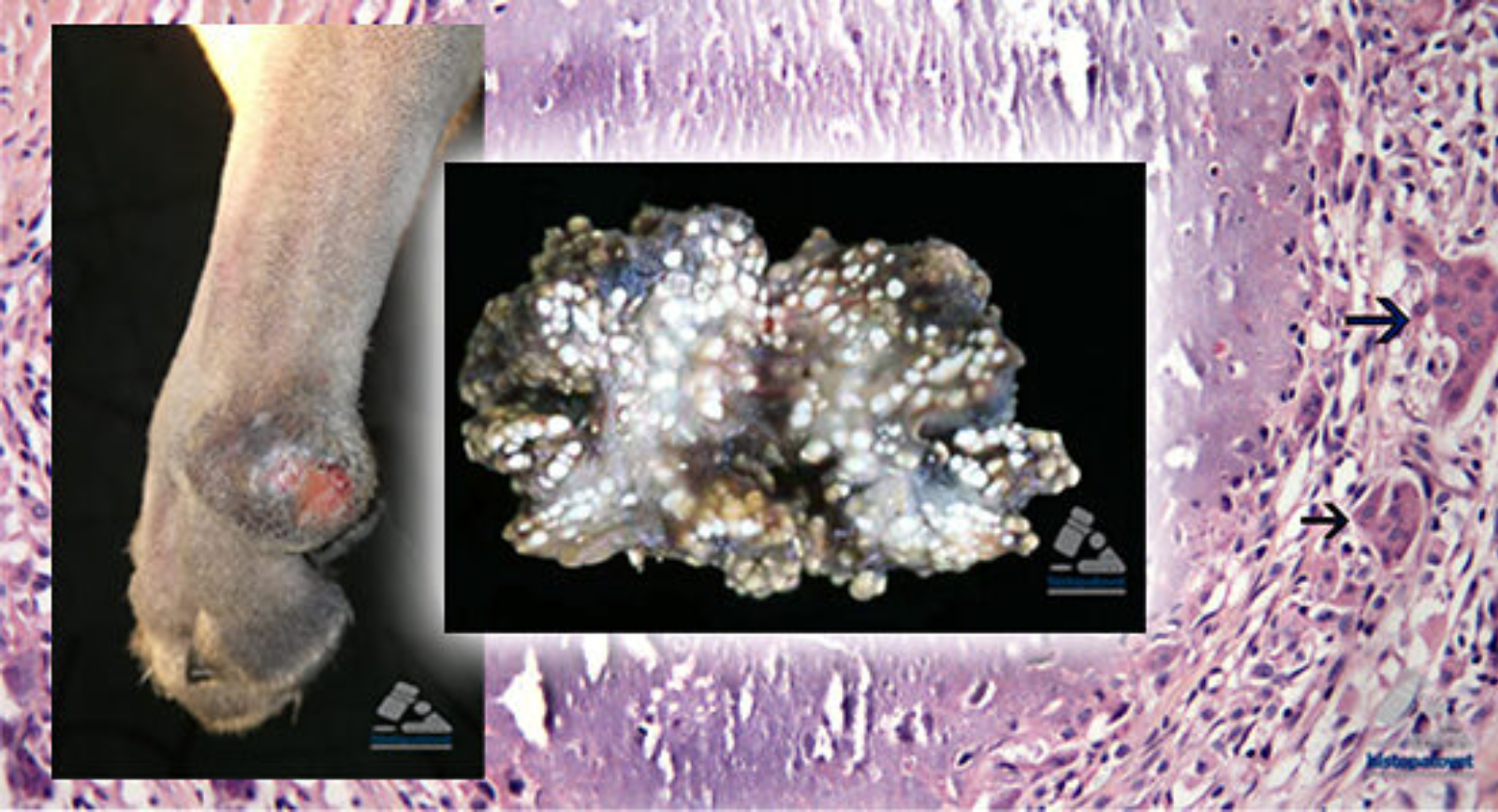 Hallazgos Macroscópicos: Se recibe una biopsia quirúrgica constituida por una amputación del I dedo y el metatarso del miembro posterior izquierdo; el cual tiene en su cara externa un nódulo localizado en el I dedo. Su diámetro es de 2.30 cms. A la superficie del corte, el nódulo está compuesto por múltiples zonas de un material blanco, el cual llega hasta la parte más profunda de la masa. Sin embargo, no se observa que esté penetrando al hueso. Ver fig.2( ilustración de otro caso).