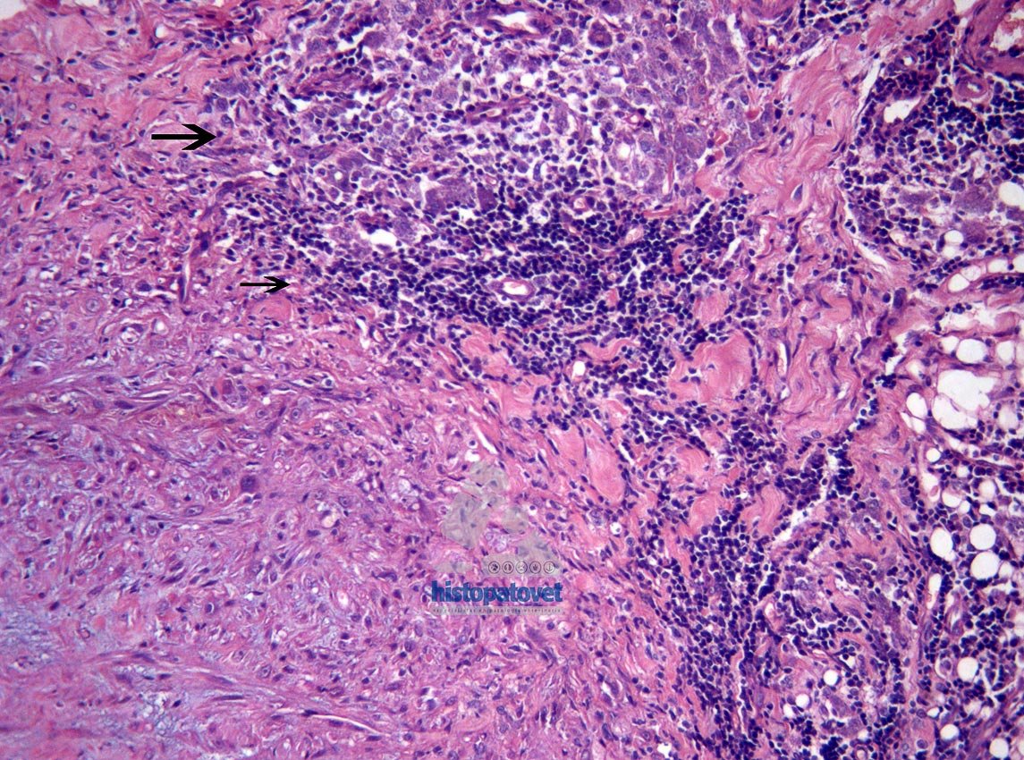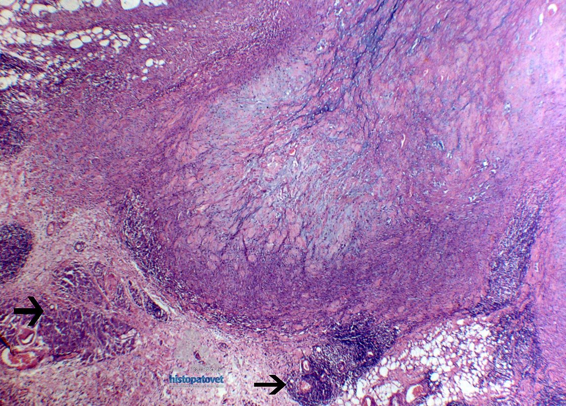 Fig.3. La masa principal en el centro. En la periferia( ver flechas), Hay acúmulos de células inflamatorias.