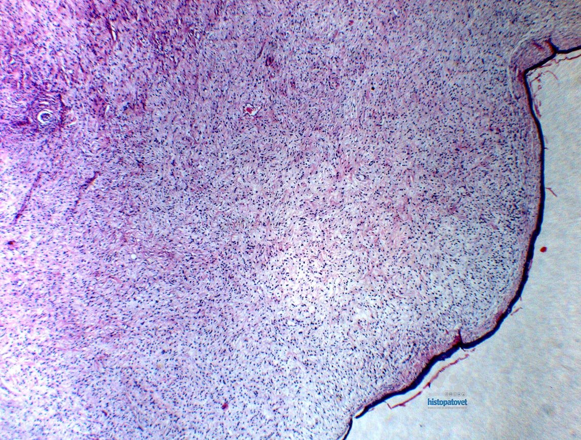 Fig. 8. Este es un fibrosarcoma, de una masa removida de entre los dos platos escapulares. Vea que no hay inflamación. El gato nunca había sido vacunado en esa sede anatómica.Tratamiento: No existe uno especifico. El principal es quirúrgico. Debido a que se ha reportado un grado de recurrencia hasta de un 45%, con uno de metástasis de 0 a 28%, es muy importante los márgenes quirúrgicos. Los autores recomienda de 3 a 5 cms. También, se ha utilizado la radioterapia y la quimioterapia, especialmente en combinación con la cirugía.