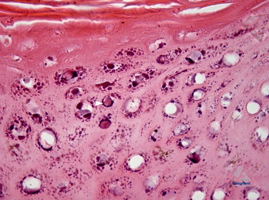 Fig.2. Acercamiento del estrato espinoso. La flecha señala una posible inclusión viral.Comentario: Para poder establecer su etiología es necesario realizar una prueba de inmunohistoquímica en parafina, técnica no disponible en Costa Rica. NOTA: Unos meses después, la prueba se realizó en el Diagnostic Center for Population & Animal Health Michigan State University, dando positiva. Ver Fig. 3-A-B.