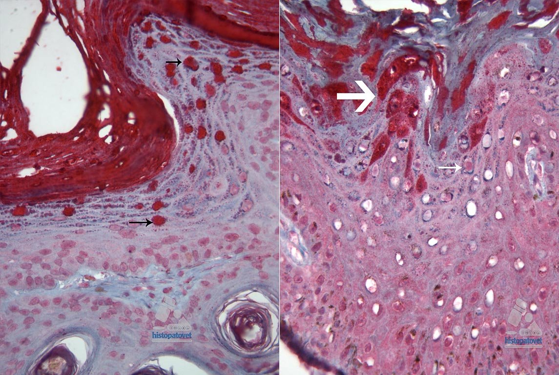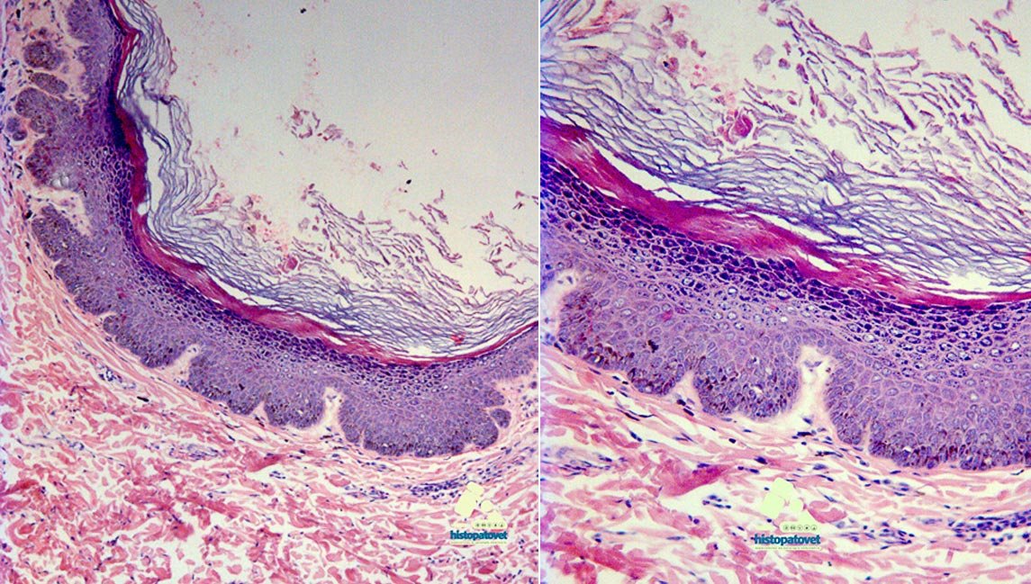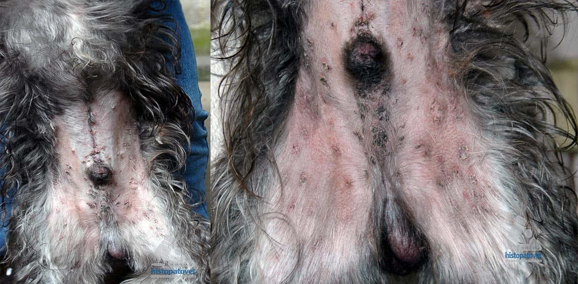 Algunas generalidades sobre los papilomas cutáneos: El virus del papiloma, está asociado a varias patologías cutáneas neoplásicas. Son muy resistentes, en su medio ambiente. Su modo de transmisión es por traumas cutáneos(piel) o en las mucosas. Es un virus con mucho tropismo a los epitelios, con sedes anatómicas muy específicas. También es bastante especie/específica. En humanos, hay descritos cerca de 100 tipos, tanto del grupo alfa como del beta, afectando especialmente a pacientes inmunosupresos. En medicina veterinaria, están descritos especialmente en caninos, felinos, equinos, cebras, tapires( sarcoide). Siendo mayormente descritos en caninos con al menos nueve diferentes tipos. En perros y gatos, hay varios trabajos publicados , demostrando que estas placas, pueden progresar( transformación) a carcinoma in situ y a carcinoma de células escamosas. De forma breve, únicamente discutiremos esta patología en caninos. El papilomavirus cutáneo, tiene seis diferentes presentaciones bien reconocidas. La forma mas común, es la formación de un crecimiento papiliformes(papiloma viral), tanto en la piel como a la mucosa oral, a veces esofágica y ocular. Afecta a caninos jóvenes y puede curar de forma espontánea. Ver las siguientes dos figuras.