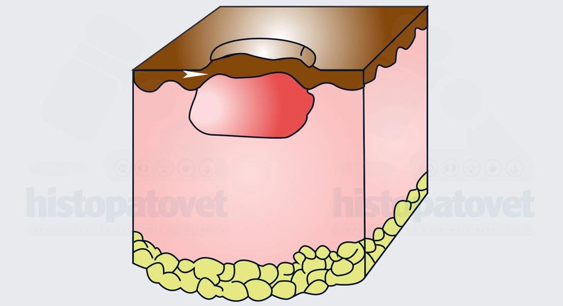 Fig.4. Ilustración. Vea la flecha indicando el engrosamiento de la epidermis.Como ya se explicó , microscópicamente hay un engrosamiento de ambos estratos de la epidermis( corneo y espinoso). Ver Fig. 5.