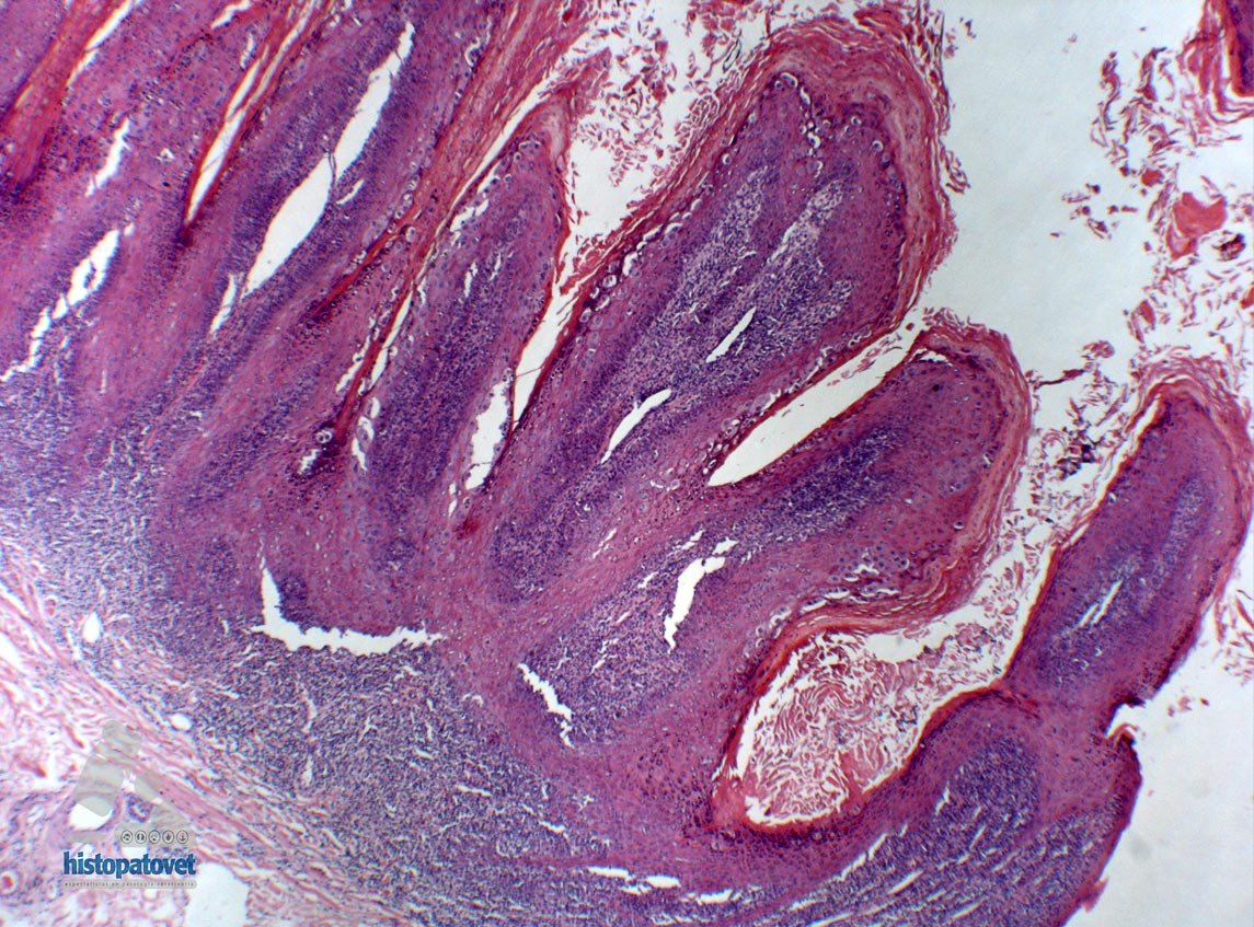 Fig.7. Aspecto microscópico. Observa el crecimiento como “dedos de las manos), con un gran de estrato corneo.Las otras presentaciones clínicas patológicas son: