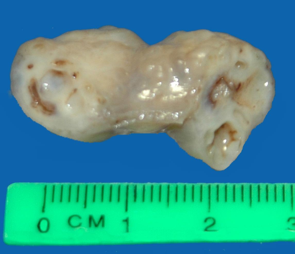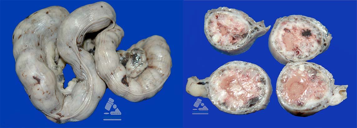 Fig. 6.A- Observe la forma nodular segmentada. La 6. B. Secciones transversales. El lumen muestra un contenido pastoso purulento.
