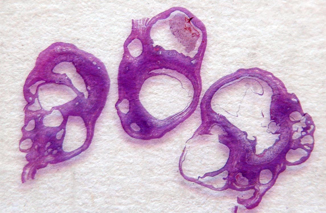 Fig. 2. Corte transversal. La serosa es irregular.La mucosa con varias cavidades.