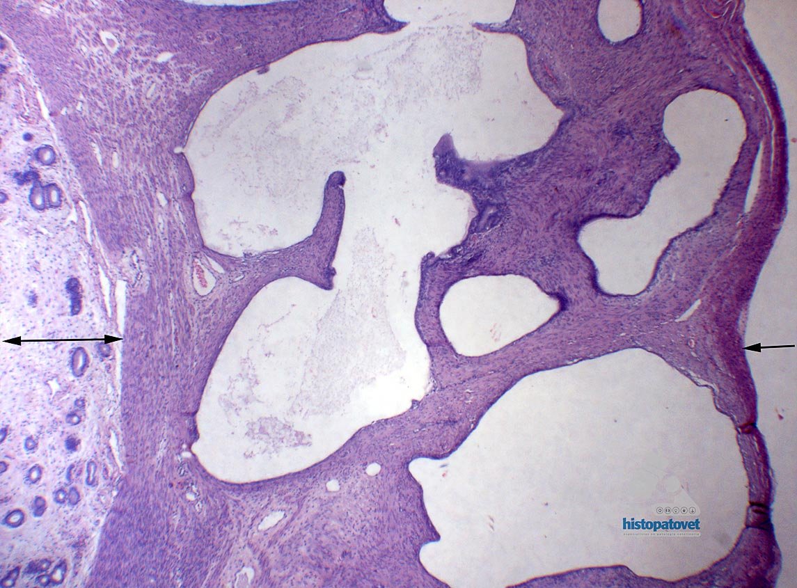 B. Examen microscópico: En la submucosa o miometrio se observa la formación de múltiples cavidades, algunas de ellas vacías, otras con un contenido levemente proteico. Las cavidades a su vez están revestidas por una monocapa de células cúbicas, algunas de ellas están atróficas. Fig.4.