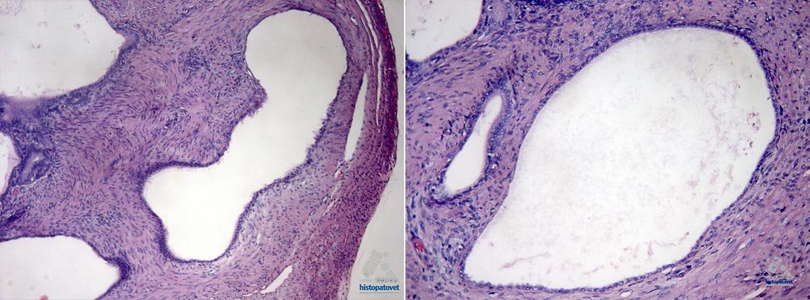 Fig.5 A y B. Crecimiento glandular dentro del músculo (miometrio). Observe que las cavidades glandulares están revestidas por una monocapa de células a veces atróficas.Además de perras y gatas la adenomiosis, afecta a roedores, primates, y mujeres.