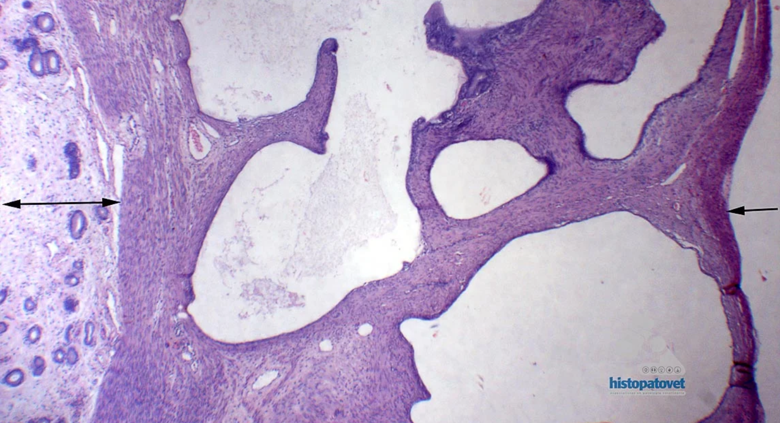 Fig.4. La flecha con doble punta (izquierda), muestra una pequeña porción de la mucosa. La de la derecha, indica la serosa. En medio de ambas flechas esta el miometrio con varias cavidades vacías.