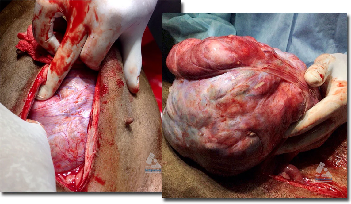 Fig. 1-2. Aspecto durante la laparotomía. Fotos cortesía del Dr. Juan José SolísHALLAZGOS MACROSCÓPICOS: Se recibe una masa adherida al útero y unida a un ovario, el cual es de aspecto normal. La masa media 26.0×12.0x8.0 cms. Al corte toda la masa estaba compuesta por al menos tres diferentes tipos de tejidos. Uno era piel, con presencia de pelos ya desarrollados. El otro componete era un tejido de consistencia dura (hueso/cartílago) y otro un tejido blando como encefálico. Ver siguientes fotos.