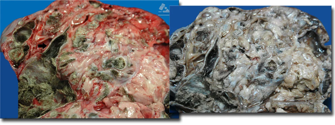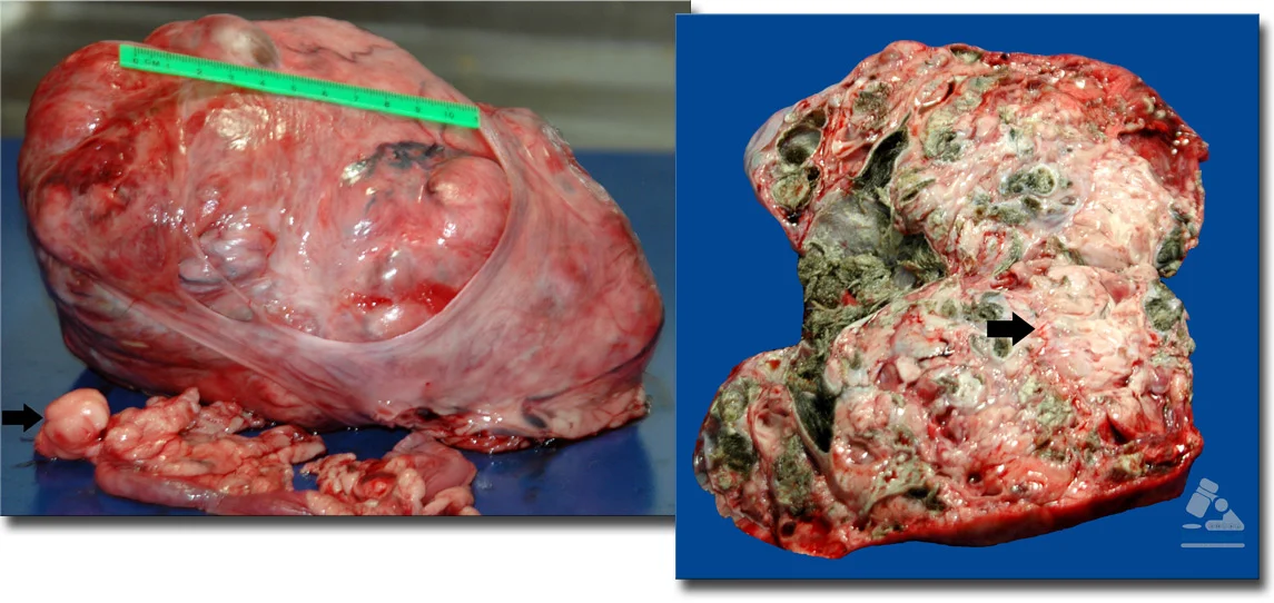 Fig.3. Masa post cirugía. A la izquierda y abajo, la flecha negra señala el ovario normal. Fig4. A la derecha el aspecto luego de hacer una incisión longitudinal. La flecha señala tejido encefálico.