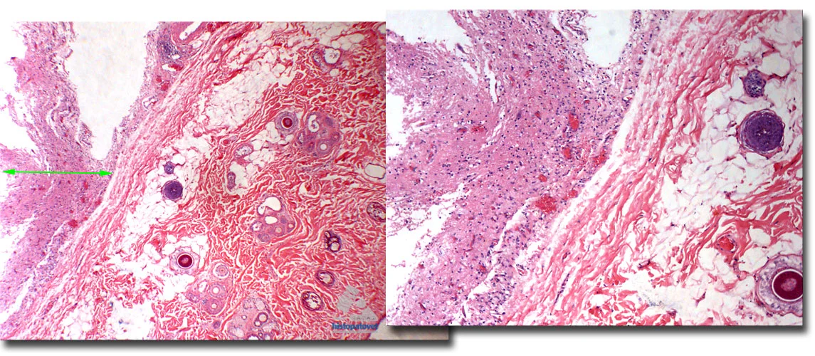 Fig.7-A. A la derecha. Hay piel(dermis) con todos sus componentes. La flecha verde indica un tejido nervioso adherido a la dermis profunda. La 7-B es el detalle.