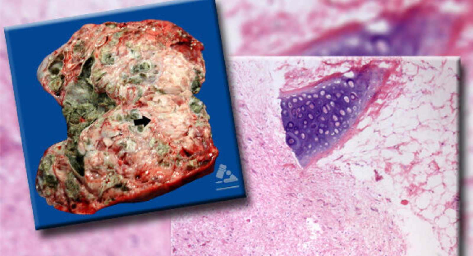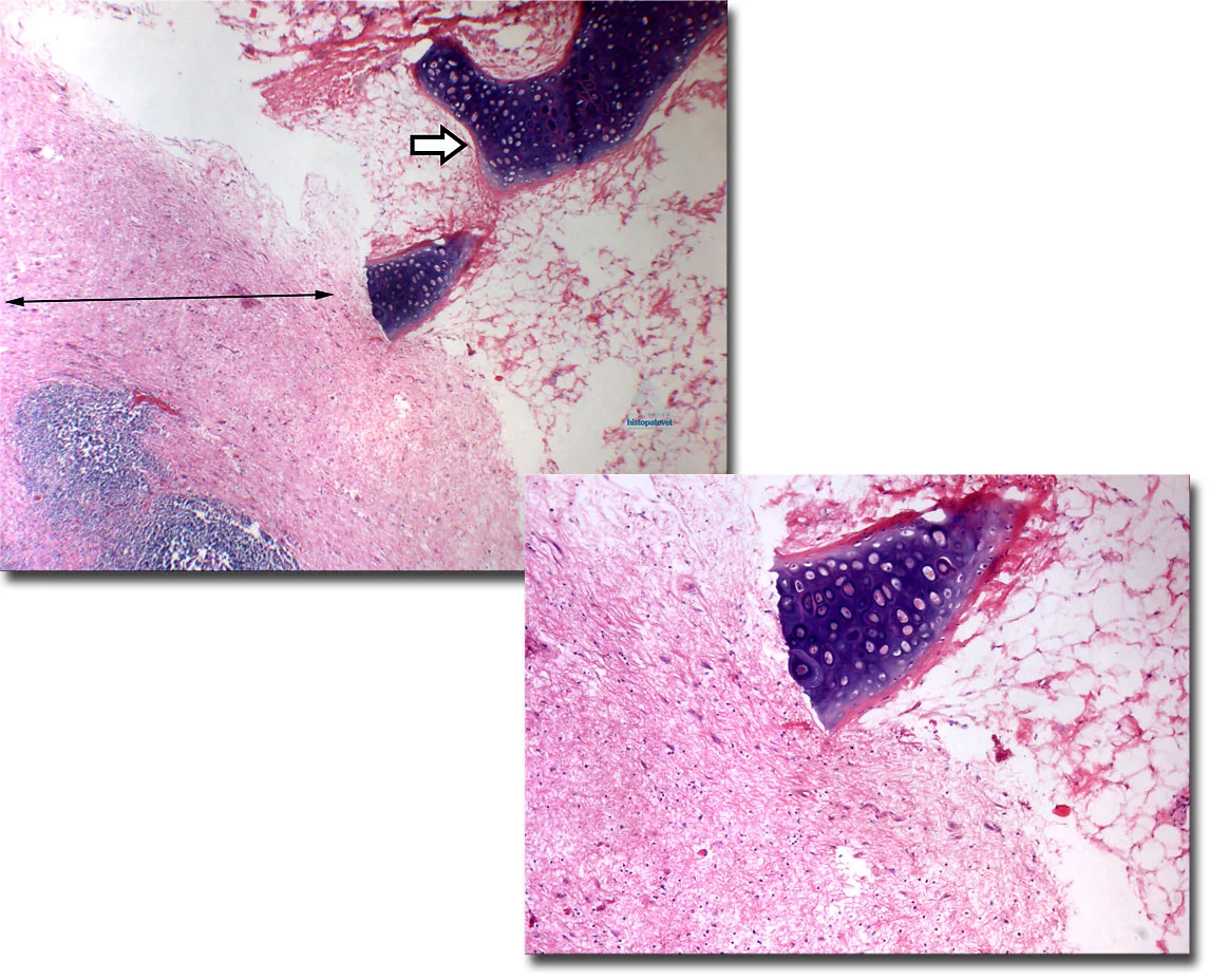 Fig.8-A- La flecha grande superior señala tejido condroide normal. El logo, abajo a la derecha esta colocado sobre tejido adiposo. La flecha larga indica toda una zona de tejido nervioso. La Fig.8-B es un detalleCONCLUSIÓN DIAGNOSTICA FINAL: Ovario Derecho. Se trata de un tumor de origen embrionario clasificado como TERATOMA.