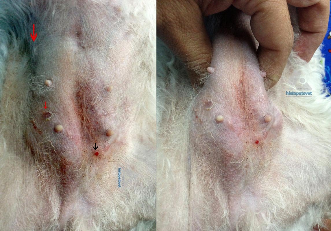 Al examen físico, las dos glándulas inguinales(izquierda y derecha) estaban calientes. Además, en la glándula derecha se palpaba la presencia de un líquido en el tejido subcutáneo, el cual se aspiro( cerca de 2.50 cc de color amarillo). Se mando con un antibiótico( Convenia®) por 15 días y Dexametasona de larga duración por 7 días.