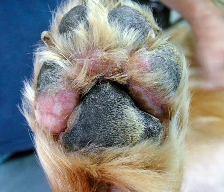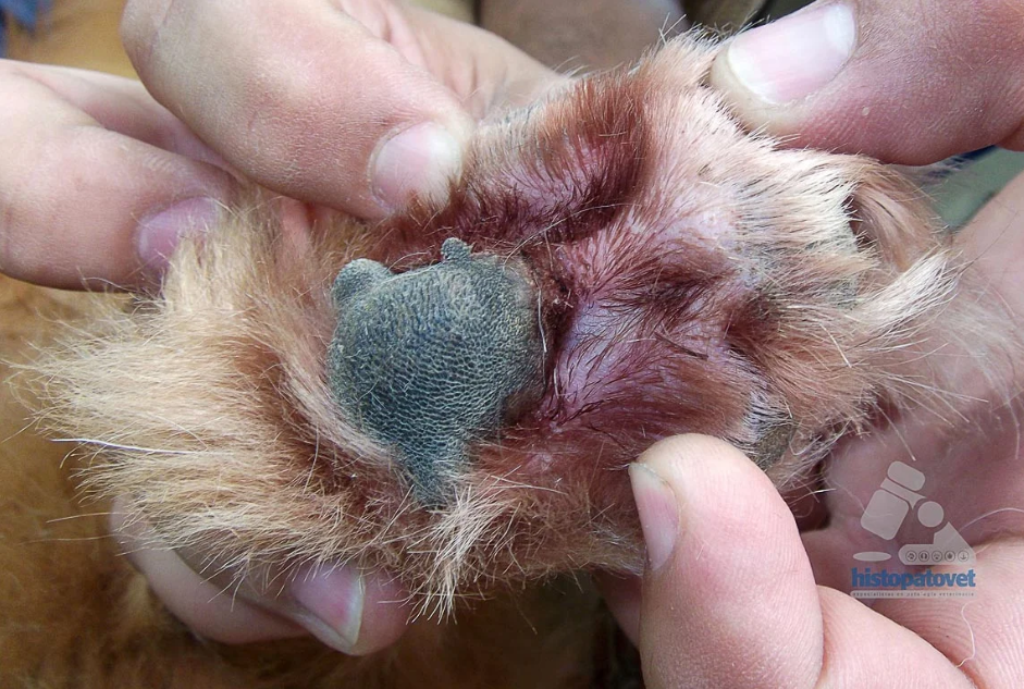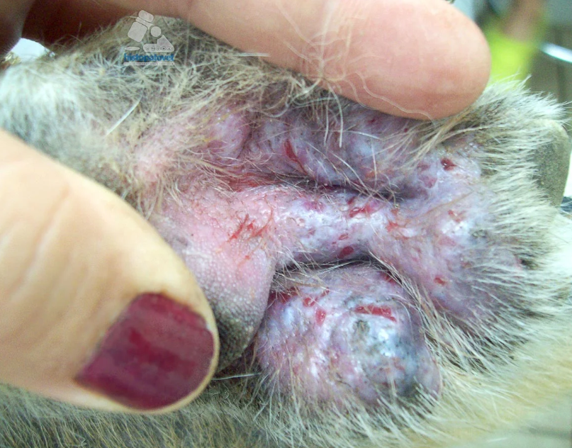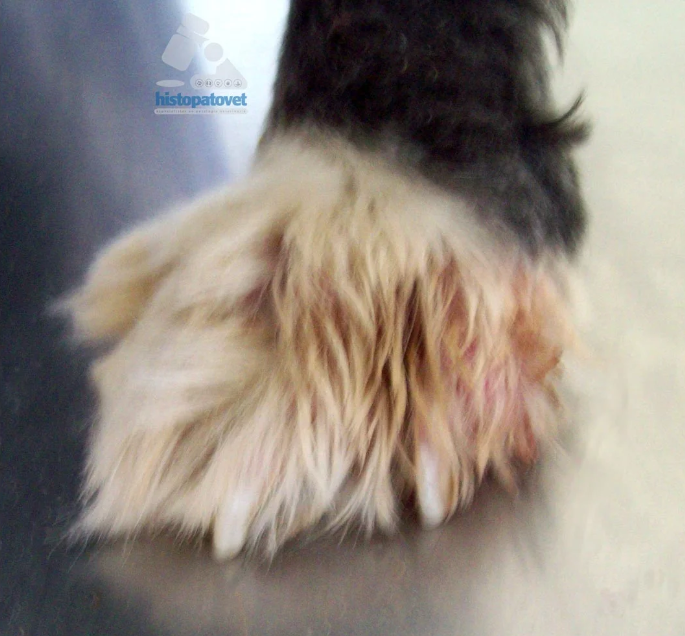 Fig.8. Hiperemia. Indicios de lamido( pelo amarillento). Caso de Malassezia sp.