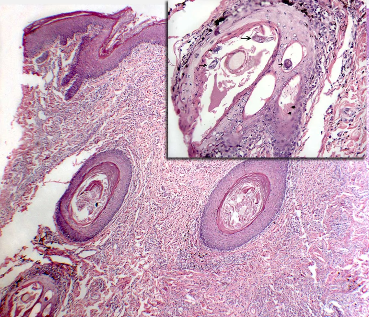 Fig. 2. Ay B. Dentro del folículo piloso, se observan varios cortes de Demodex sp.