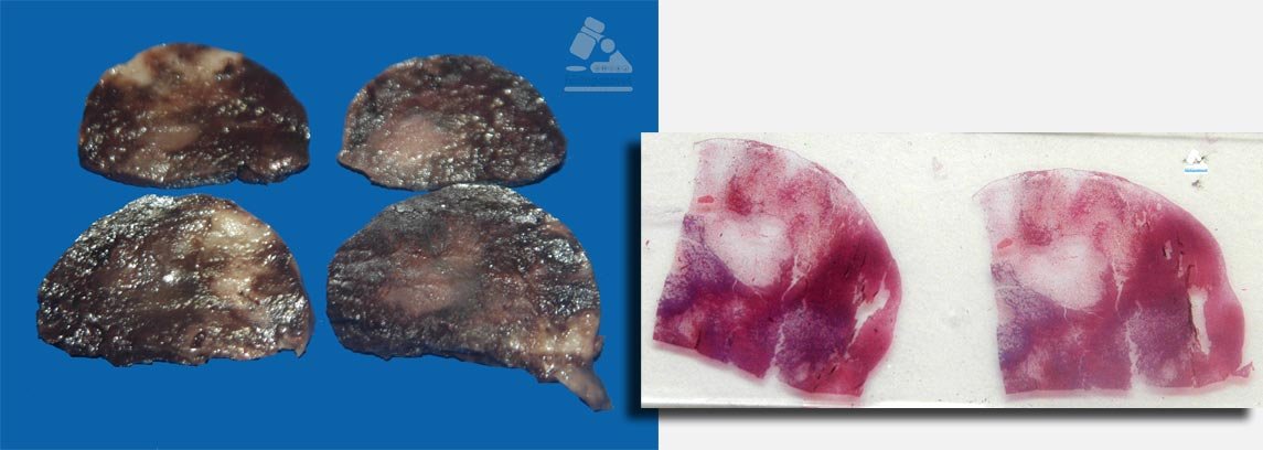 Descripción de los hallazgos patológicos: Se reciben dos trozos de bazo. El de mayor tamaño mide 6.0 cms de diámetro; con una coloración rojo-oscura.El otro trozo mide 4.0 cms, mostrando zonas blancas y oscuras. Ver Fig2-3.