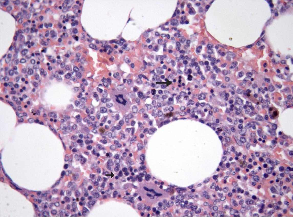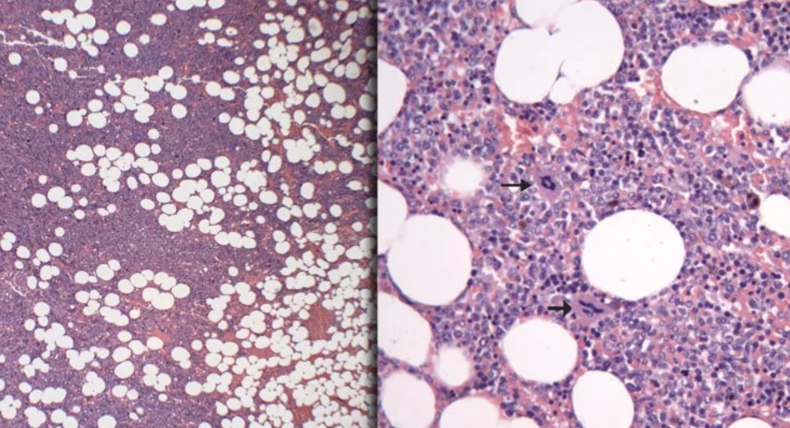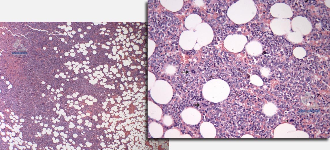 Las zonas blancas están compuestas por células con mucho citoplasma vacío y un núcleo pequeño. En medio de estas células hay eritrocitos, muchos megacariocitos mezclados con células hematopoyéticas inmaduras. Ver siguientes figuras.